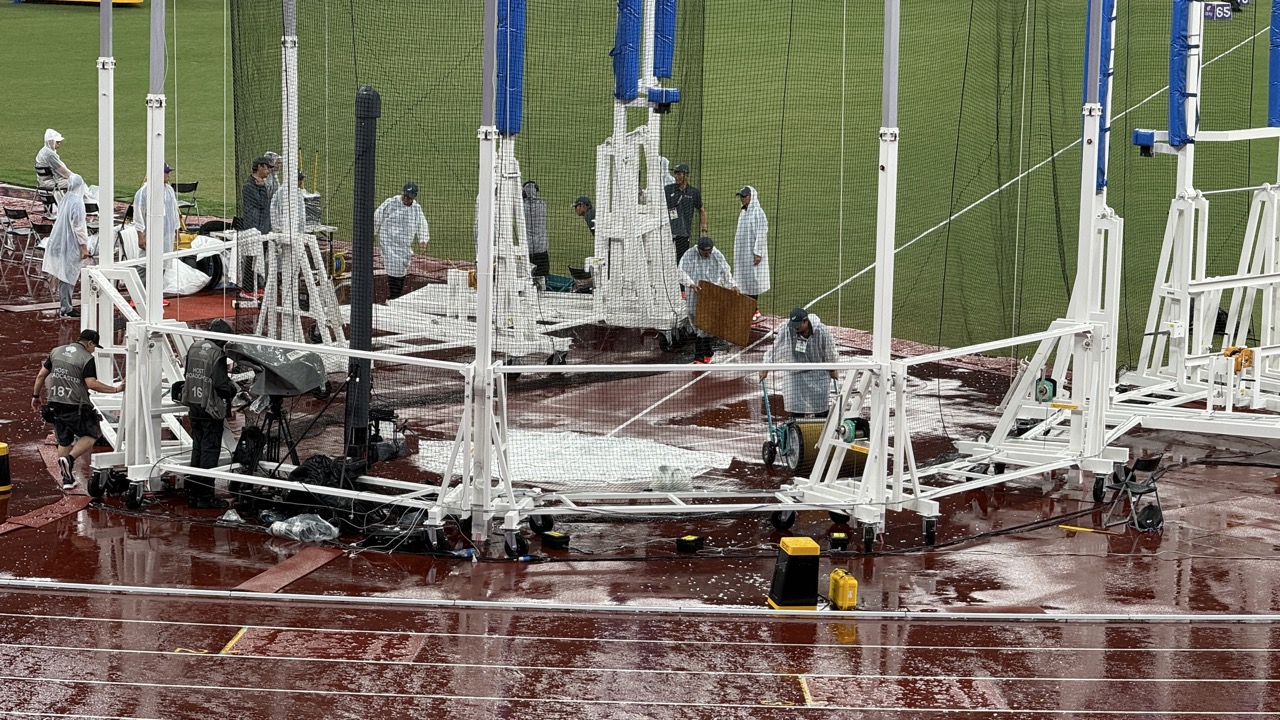 小雨から大粒の雨となり、円盤投は約2時間休止。水没したフィールドをスタッフの方たちがタオルで懸命に拭いていました。