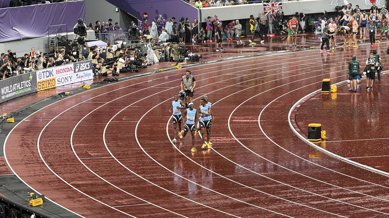 男子400mリレー決勝は雨でも進行。トラックは所々に水溜りがありましたが、選手たちは気にせず駆け抜けていきました。